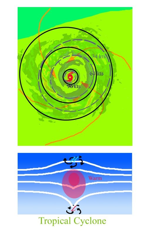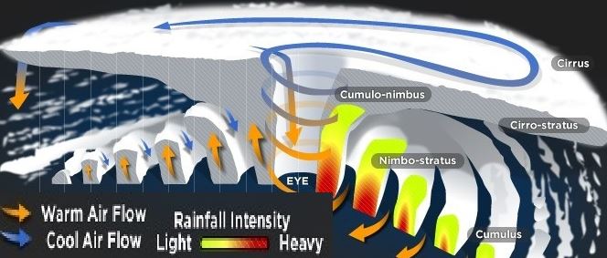 8- الأمطار : في الأعاصير المدارية تهطل الأمطار بشكل غزير جدا في ساعات حيث يمكن أن تتجاوز 800ملم و تؤدي إلى حدوث فيضانات مع رياح نشطة جدا تسبب في أضرار كبيرة. الفترة الزمنية للأمطار المصاحبة للإعصار تكون أقل من يومين كتأثير مباشر.