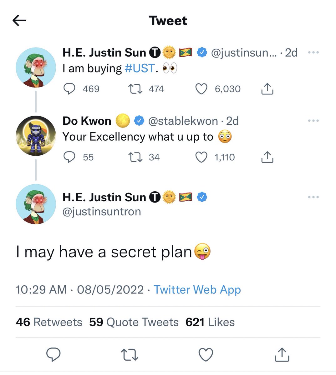 - بعد الشراء تم نشر تقارير وتغريدات هدفها التشكيك في قدرة مؤسسة لونا “LFG” بالحفاظ على عملتهم الثابتة في حال هبوط السوق.