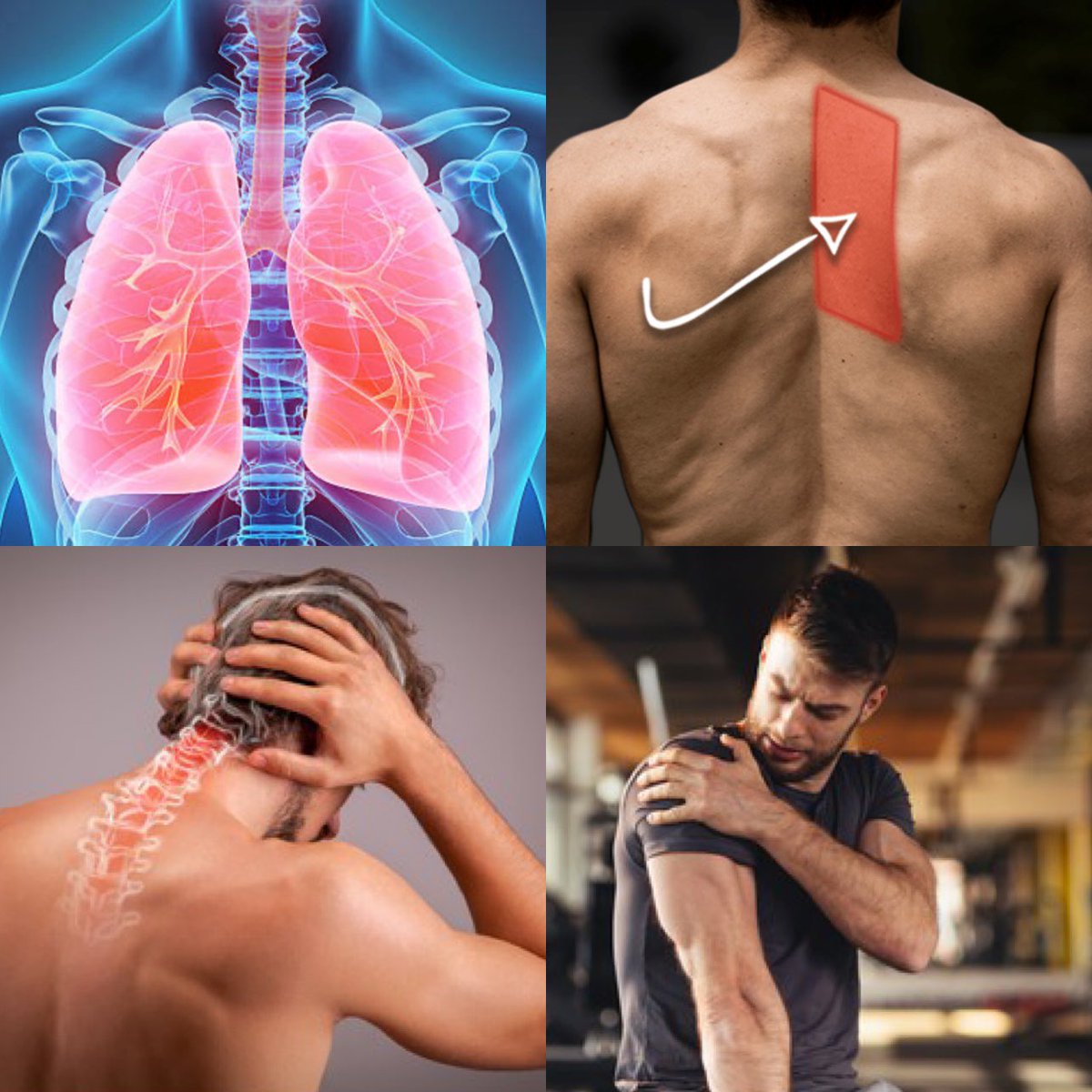🔸آلام في الصدر بين الكتفين وضيق التنفس