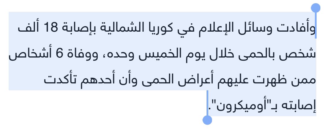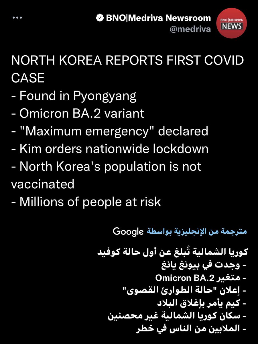 أمر رئيس كوريا الشمالية كيم بإعلان حالة الطوارئ بعد تسجيل أول إصابة متحور أوميكرون،وتم التأكد إن العينات التي تم جمعها من العاصمة بيونغيانغ أثبتت أنها إيجابية لفيروس كورونا في يوم 8 مايو قبل 4 أيام ووجد التسلسل الجيني لمتحور الجديد BA.2 الذي يمتاز بقدرته العالية على التفشّي.