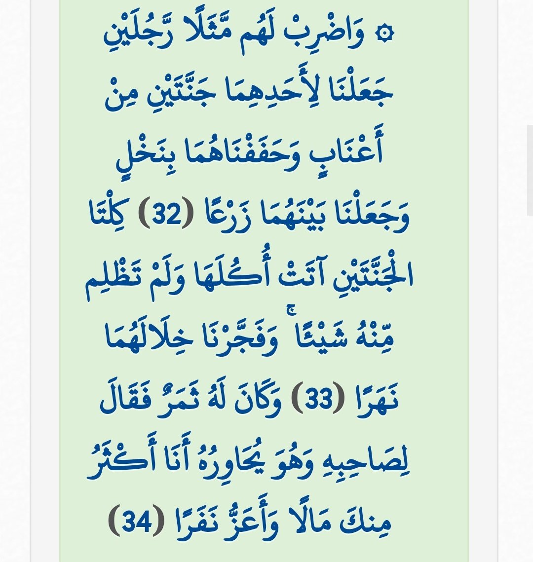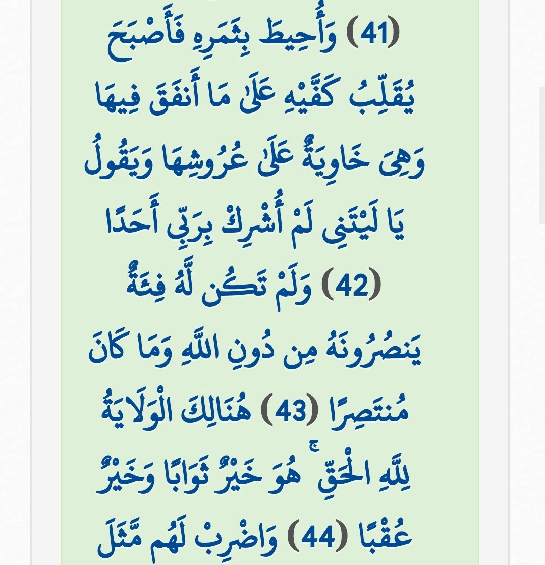 { ويقول يا ليتني لم أُشرِك بربّي أحدًا * ولم تكُن له فئةٌ ينصرونه من دون اللهِ وما كان مُنتصرًا * هنالك الوَلايةُ لله الحق هو خيرٌ ثوابًا وخيرٌ عُقُبًا }.