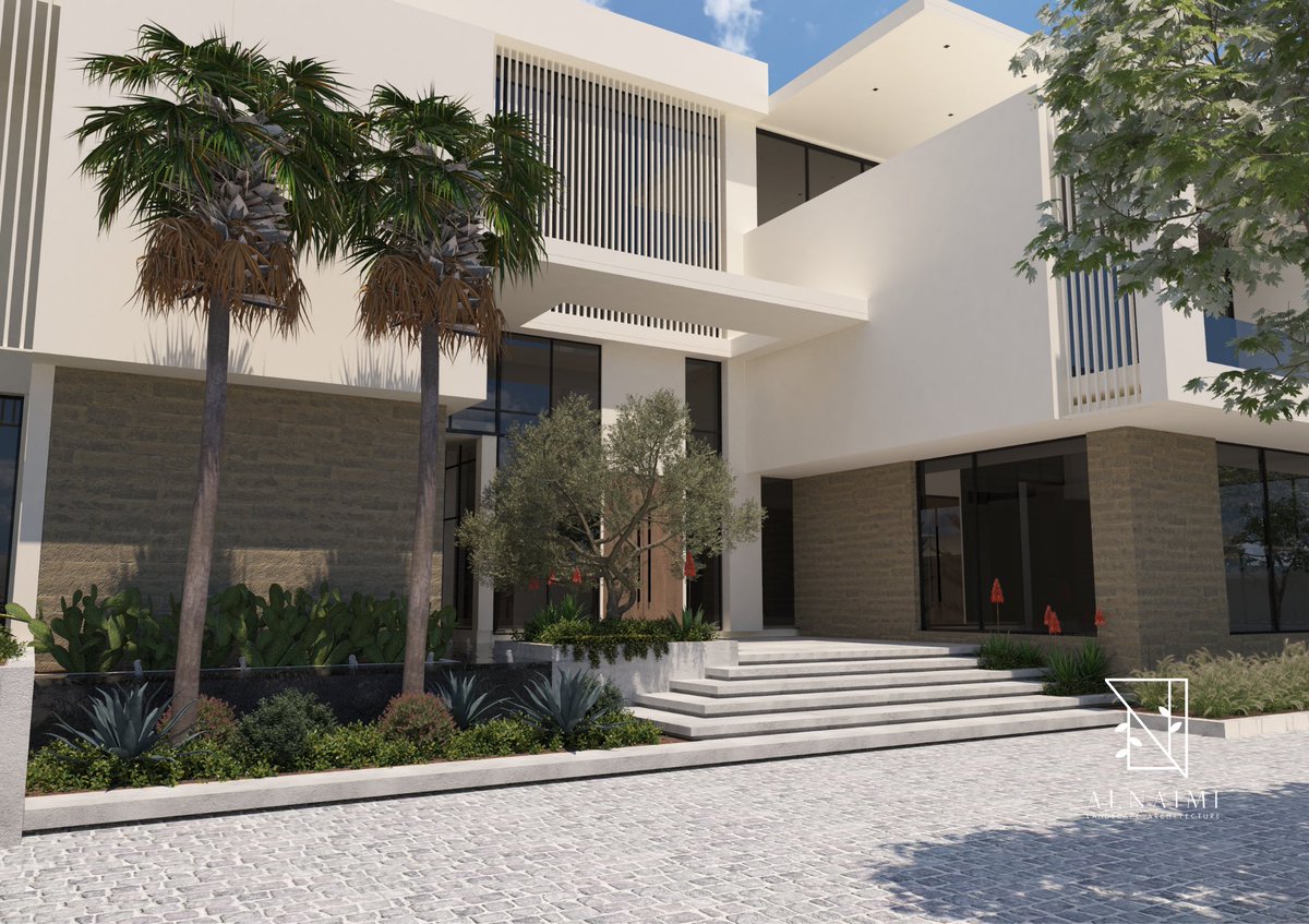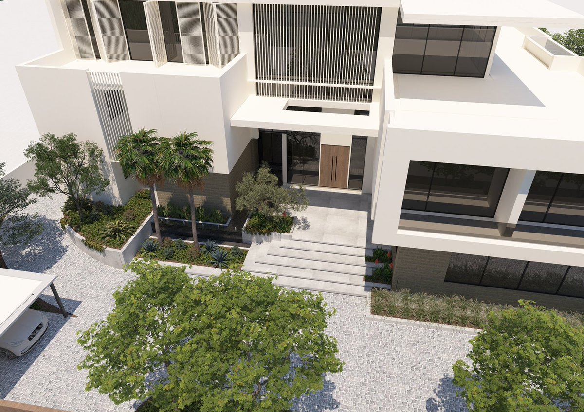 تم تعزيز مدخل المنزل بتصميم يدمج الدرج مع الأحواض الزراعية والمسطح المائي، وذلك عبر إبرازه للخارج وتوجيهه إلى ناحية مواقف السيارات.