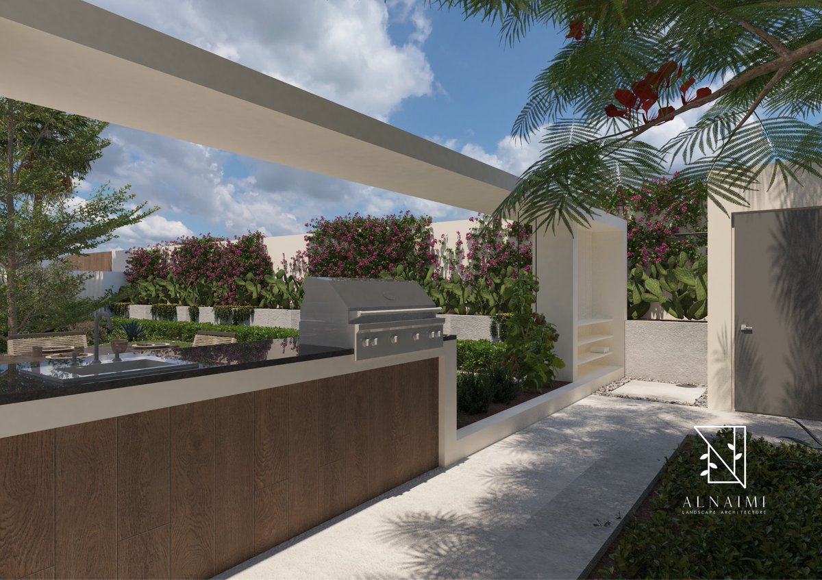 الحديقة الخلفية مصممة بحيث يمكن في المناسبات استعمال التيراس الأمامي ومساحة العشب كمنطقة واحدة عند إزالة الأثاث المتحرك بينهما، وفي الأيام العادية هي مقسمة بحيث تحتوي منطقة تشميس ومنطقة طعام متصلة بمطبخ خارجي مدمج بحوض لزراعة الخضار و الورقيات.