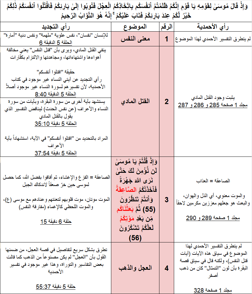 يوجد موضوعان إضافيان لم تتم مقارنتهما، لأن "النحرير" تطرق لها في حلقاته، ولكنها لا توجد في كتاب الأحمدية أصلا، لأن آياتها توجد في آيات لم يتم تفسيرها في كتاب "التفسير الكبير" للأحمدية.