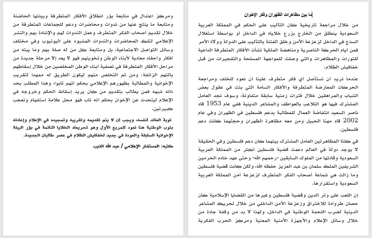 1⃣2⃣ ومن خلال مراجعة تاريخية كان التأليب على الحكم في المملكة العربية السعودية ينطلق من الخارج بزرع خلاياه في الداخل أو بواسطة استغلال السذج في الداخل لزعزعة الأمن وخلق الفتنة بالتأليب على الدولة وولاة الأمر فمن أيام الحركة الناصرية ومناهضة الملكية نشأت الأفكار المتطرفة الداعية.