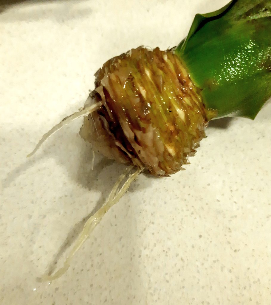 بعد شرائك لثمرة اناناس اختار ذات اوراق نظرة وخضراء وليست ذابلة افصل قمتها ونضفها من الاسفل من الاوراق وضعها في ماء مع تغير الماء على فترات حتى تخرج الجذور