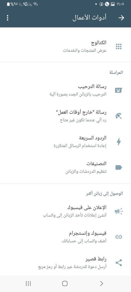 اول خدمه وهي الكتلوج و التي تسمح لك في انشاء كتلوج للخدمات او العروض والتي تقدمها و بامكانك مشاركتها عبر الواتساب او فيس بوك او انستقرام بشكل منظم و جميل