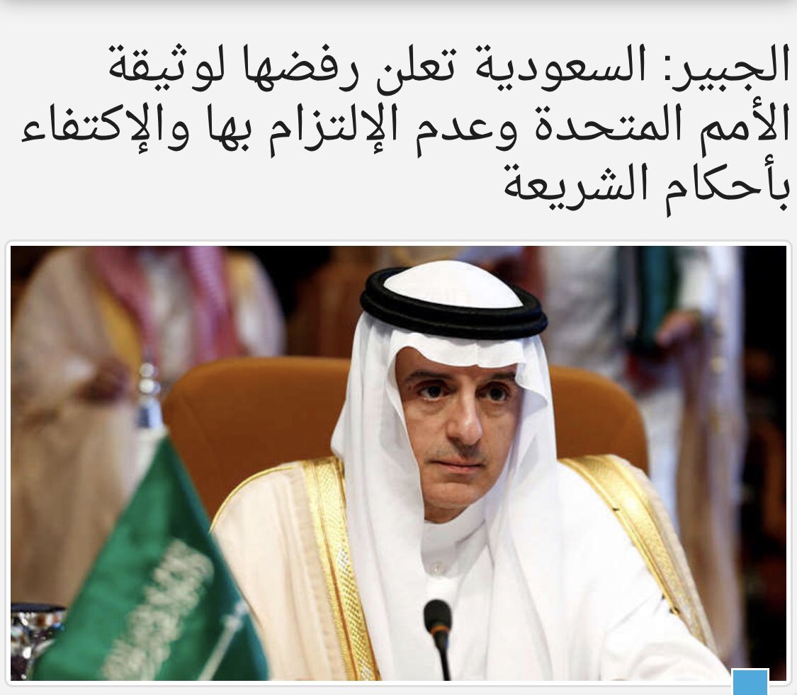 صرح وزيرالدولةللشؤون الخارجيةعادل الجبيرأن السعوديةتعلن رفضها لوثيقةالأمم المتحدةوعدم الإلتزام بها وبحقوق الشذوذ والزنا والفجور والإكتفاء بأحكام الشريعة.