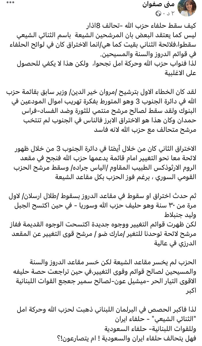 ليس كما يعتقد البعض بان المرشحين الشيعة المرشحين باسم الثنائي الشيعي سقطوا،فلائحة الثناني بقيت كما هي/انما الاختراق كان في لوائح الحلفاء في قوائم الدروز والسنة والمسيحين.