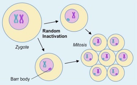 🔻جين Xist: هو الجين المسؤول عن تعطيل كروموسوم X، الذي ينتج عنه non-coding RNA (lncRNA) ولا يتم ترجمته الى أي بروتينات في الخلية مما يؤدي إلى تعطيل كروموسوم X.