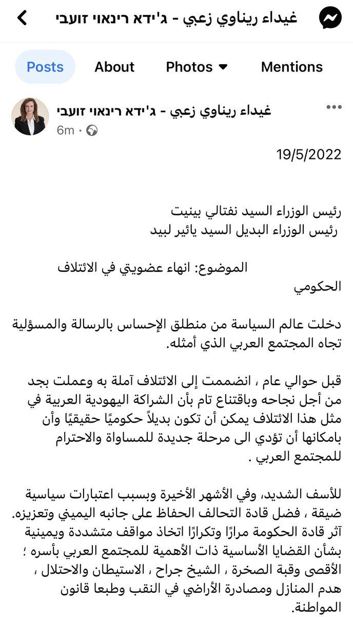 عاجل | عضو الائتلاف الحكومي الإسرائيلي عن "ميرتس" غيداء ريناوي زعبي تنحسب من الائتلاف الحكومي الفاقد للأغلبية أصلا.