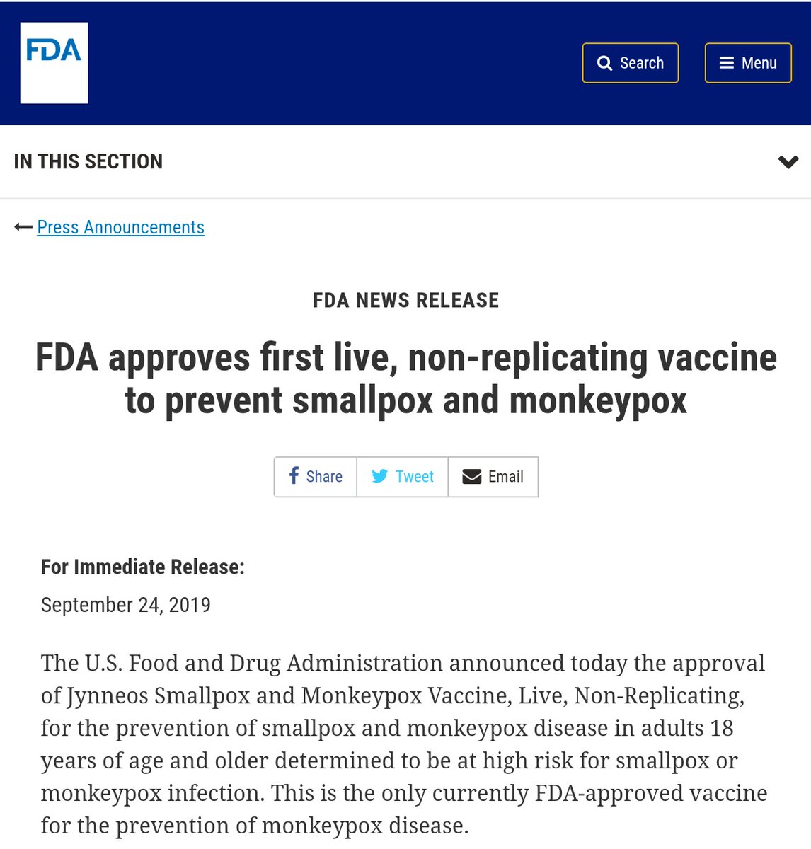 والFDA في سبتمبر 2019 اعطت ترخيص لاستعمال اول لقاح حي (لا يتكاثر) ضد الجدري وجدري القرود 😐... صانع الحرائق هو اللي عارف مصدرها