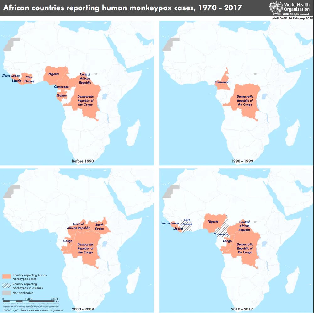 - حدثت هناك عدة حالات تفشي لڤايروس جدري القرود في الكونغو منذ العام 1970 (قرابة 1500 حالة)، وفي الولايات المتحدة الأمريكية في عام 2003 (17 حالة، ولا حالة وفاة).