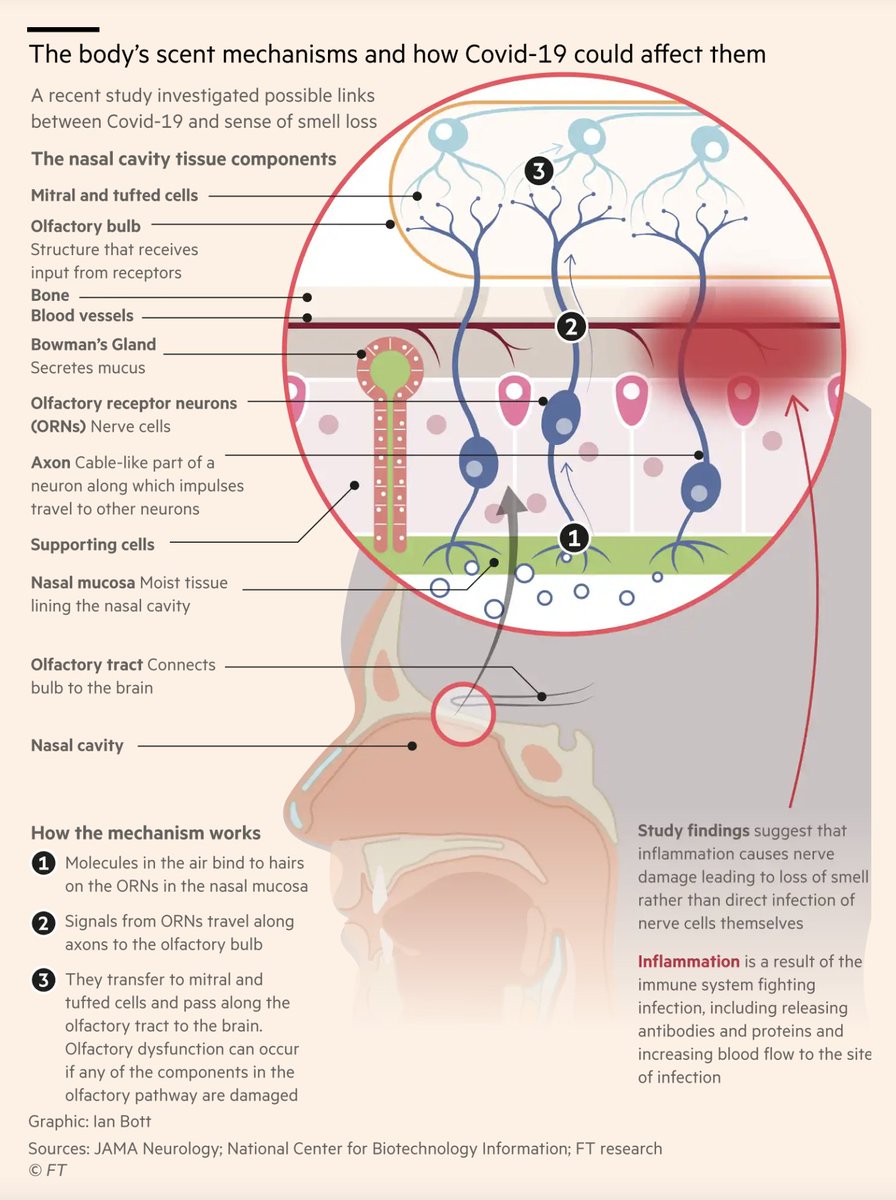 كشفت النتائج عن حدوث انكماش في سمك المادة الرمادية في قشرة المخ، تلف في مناطق الشم ومستوى تدهور إدراكي أعلى في مجموعة المصابين، مقارنة بالغير مصابين