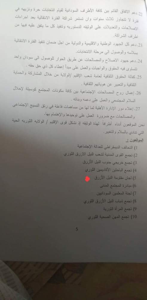 درجت العادة عبر قنوات اتصالنا المشتركة لمناقشة وتفوض من يوقع نيابة عنا بإسم لجان مقاومة النيل الأزرق، ولم نطلع بشكل رسمي علي أي وثيقة ولم نتواصل أو ننسق أو نجتمع مع اللجنة القائمة على أمر هذا التحالف كما جاء حسب زعمهم.