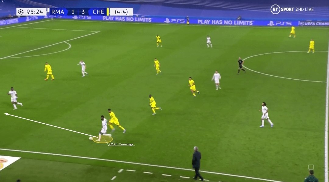 من هنا، لن يزداد كامافينغا إلا تطورًا ولاسيما في دور متقدم يُمكنه من كسر خطوط الخصم في الثلث الأوسط ثم التقدم بالكرة إلى الثلث الأخير من خلال انطلاقاته السريعة وإمداد بنزيما، فينيسيوس أو رودريغو بالتمريرات.