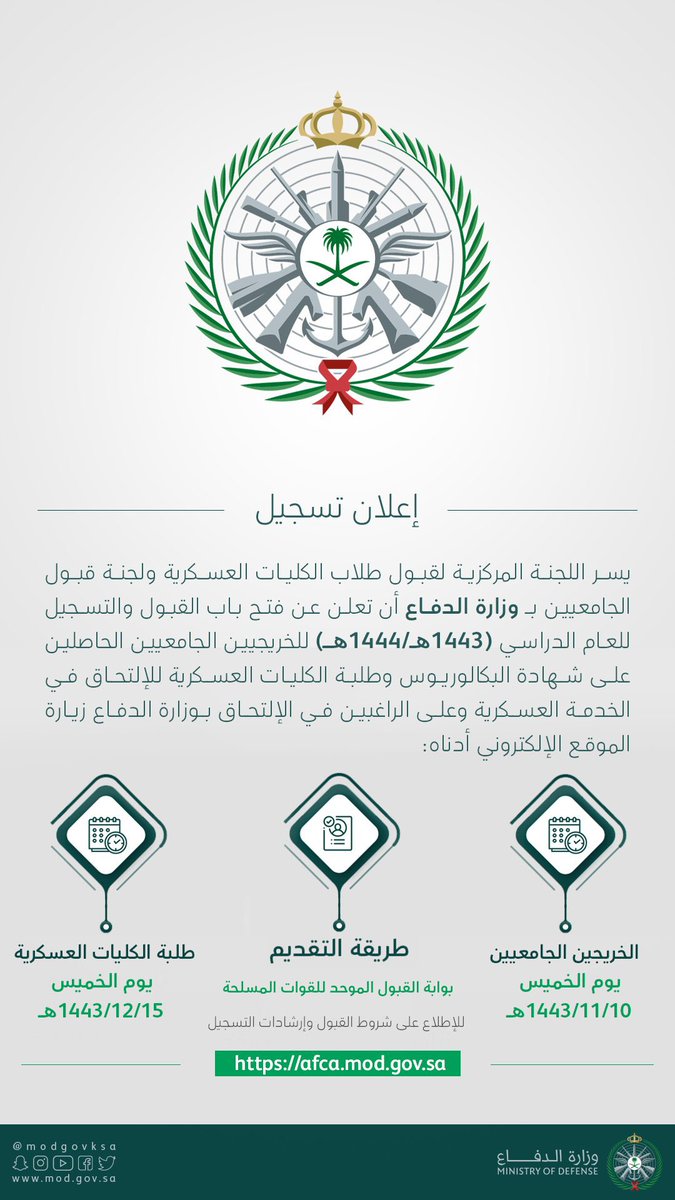 لجنة القبول والتسجيل بكلية الملك خالد العسكرية بـ #وزارة_الحرس_الوطني فتح باب التسجيل للعام الدراسي 1444هـ لحملة الشهادة الجامعية 👨🏻⚕️🎓 ويستمر الى الخميس القادم