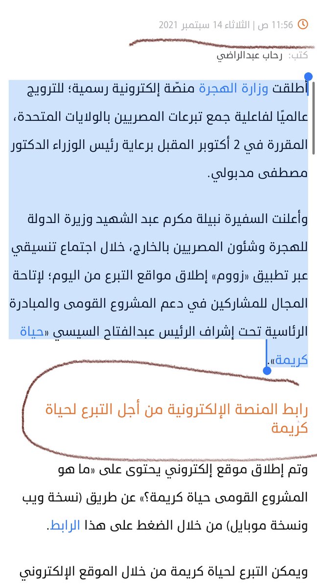 ١٢- وصلني منذ قليل هذا الرابط ويتضمن حملة لجمع التبرعات من المصريين في أمريكا لصالح مشروع حياة كريمة، الحملة - كما هو مكتوب- تابعة للسيدة ليلى بينس وزوجها. لا توجد لدى أي معلومات سوى الرابط التالي :