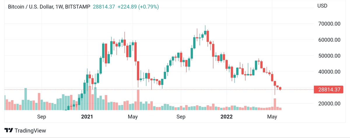 حيث أغلق #البتكوين الاسبوع بشمعة حمراء محققا ثامن شمعة حمراء هبوطيه على التوالي لاول مره في التاريخ.