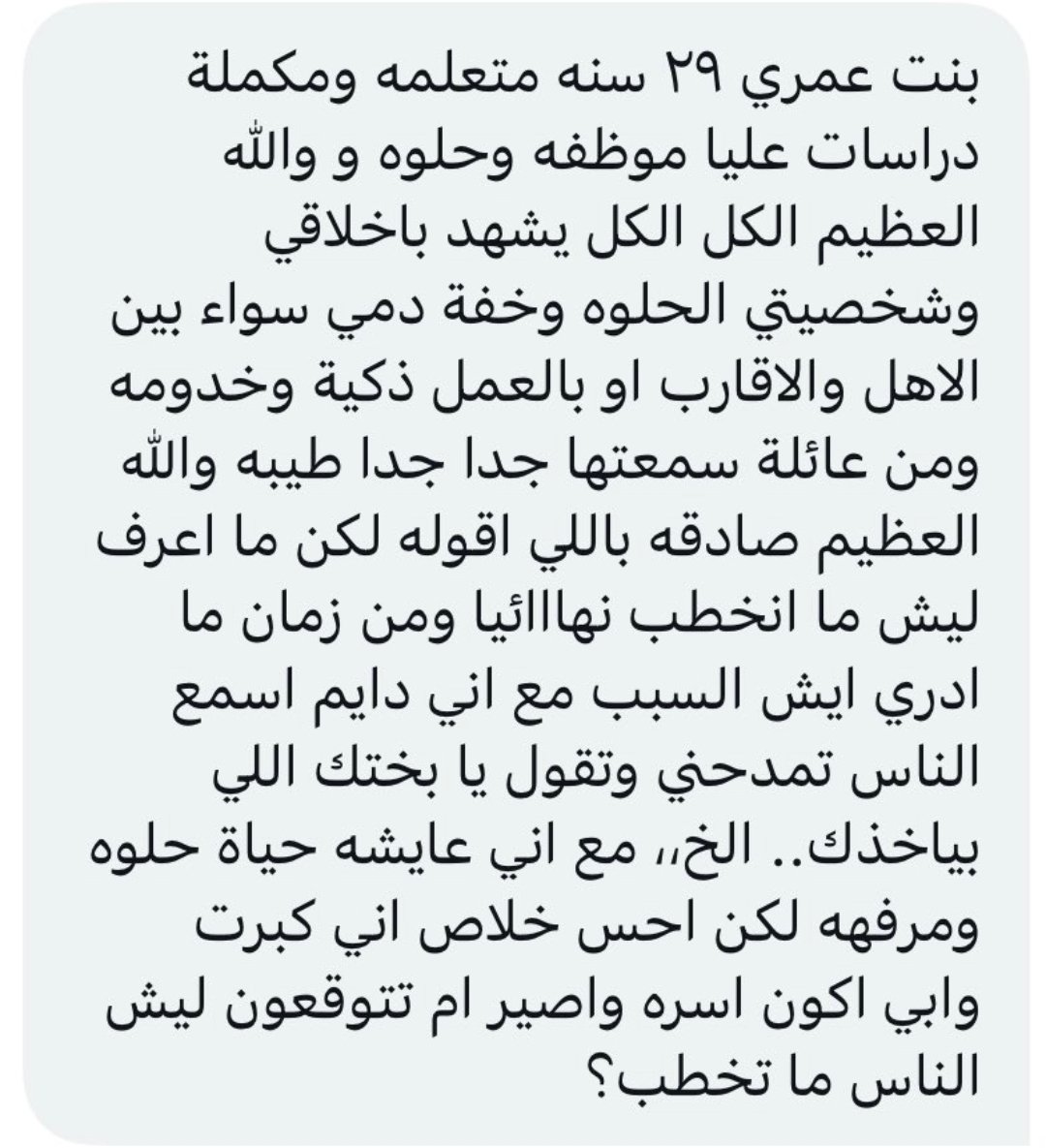 ٤- معضلة الخاطب المنبوذ: تشك لماذا قرر أن يترك الصغيرات ويختارها من بينهن، فإما هو منبوذ وإما يطمع في مالها وتظنه أقل ذكورة من أقرانه.