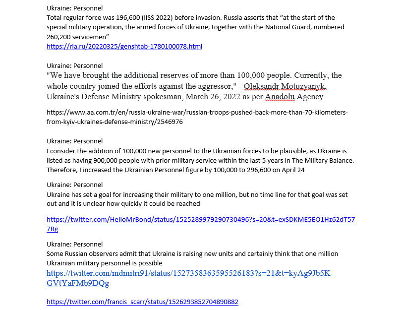 I will use 550,000 as the number of Ukrainian personnel. This considers ~300,000 as a base as of March 26, the statements of Zelensky and Chmut, the donation of more than 150,000 helmets and the idea that some personnel may be in training or under-equipped