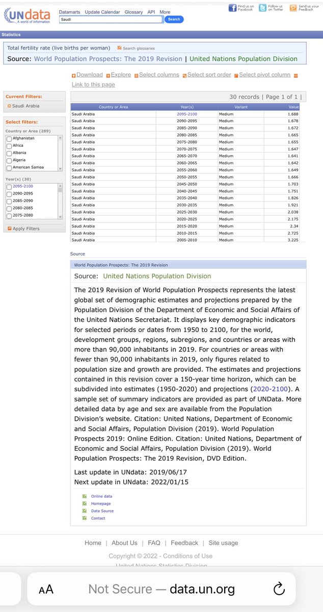 Chart and table of the Saudi Arabia fertility rate from 1950 to 2023. United Nations projections are...