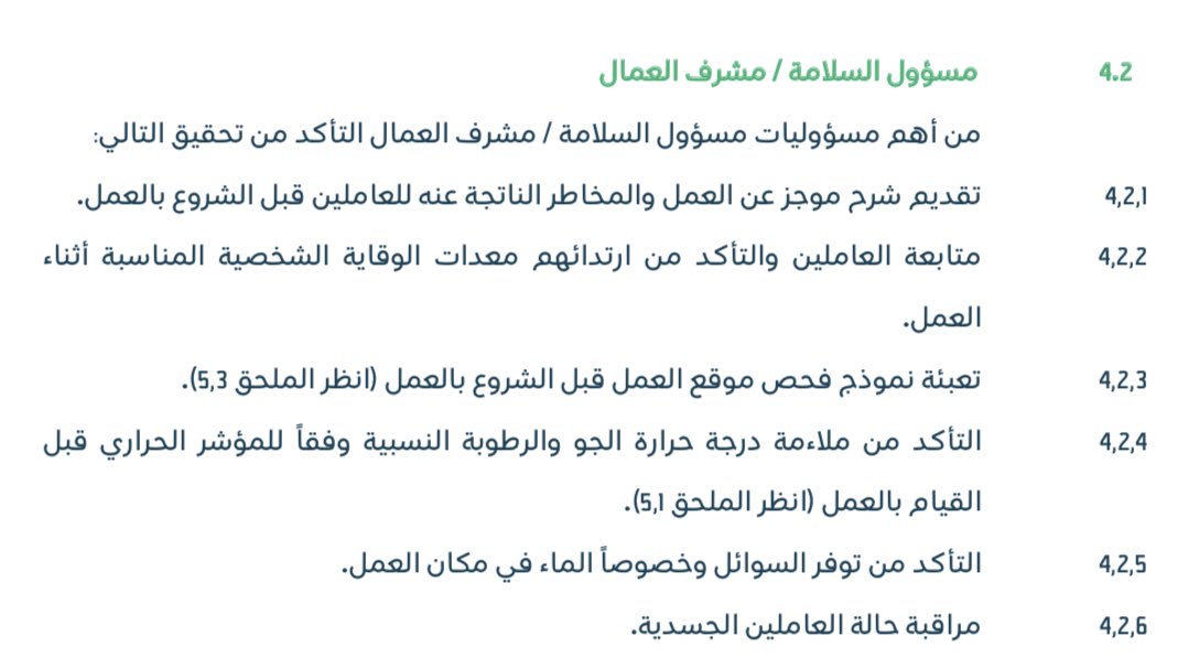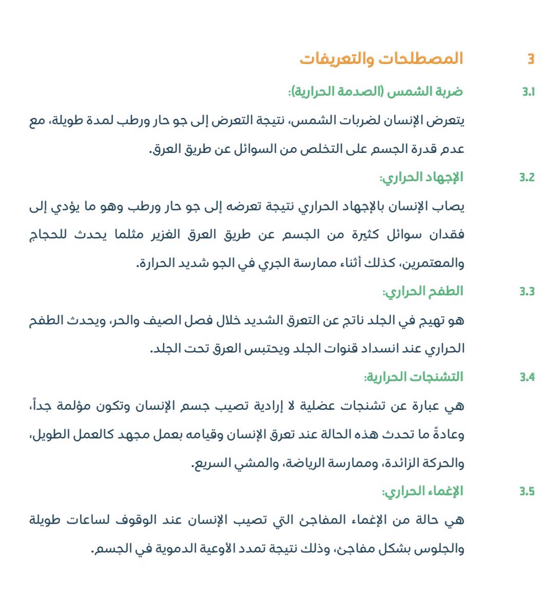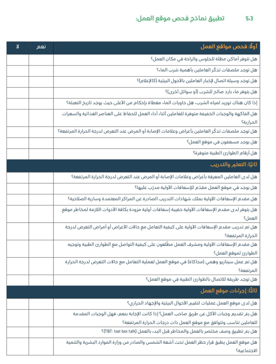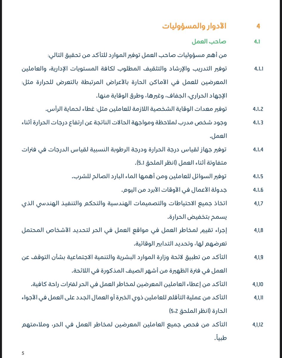 - الدليل الإجرائي للسلامة والصحة المهنية للوقاية من اثار التعرض للشمس والاجهاد الحراري - يحدد المسئوليات والارشادات- ادارة السلامة والصحة المهنية -وزارة الموارد البشرية والتنمية الاجتماعية. جهة تشريعية ورقابية.