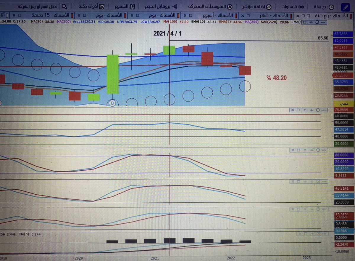 شارت لسهم الفخاريه بتاريخ ٤ / ٦ / ٢٠٢٢ على فاصل ربع سنوي بالمؤشرات الفنيه ووصل السعر إلى ٥٦ وتاريخ إنذار السلبيه بتاريخ ٣ / ١ / ٢٠٢١ وسجل الأدنى ٣٩.٧٠ بتاريخ ٢٨ / ١١ / ٢٠٢٢