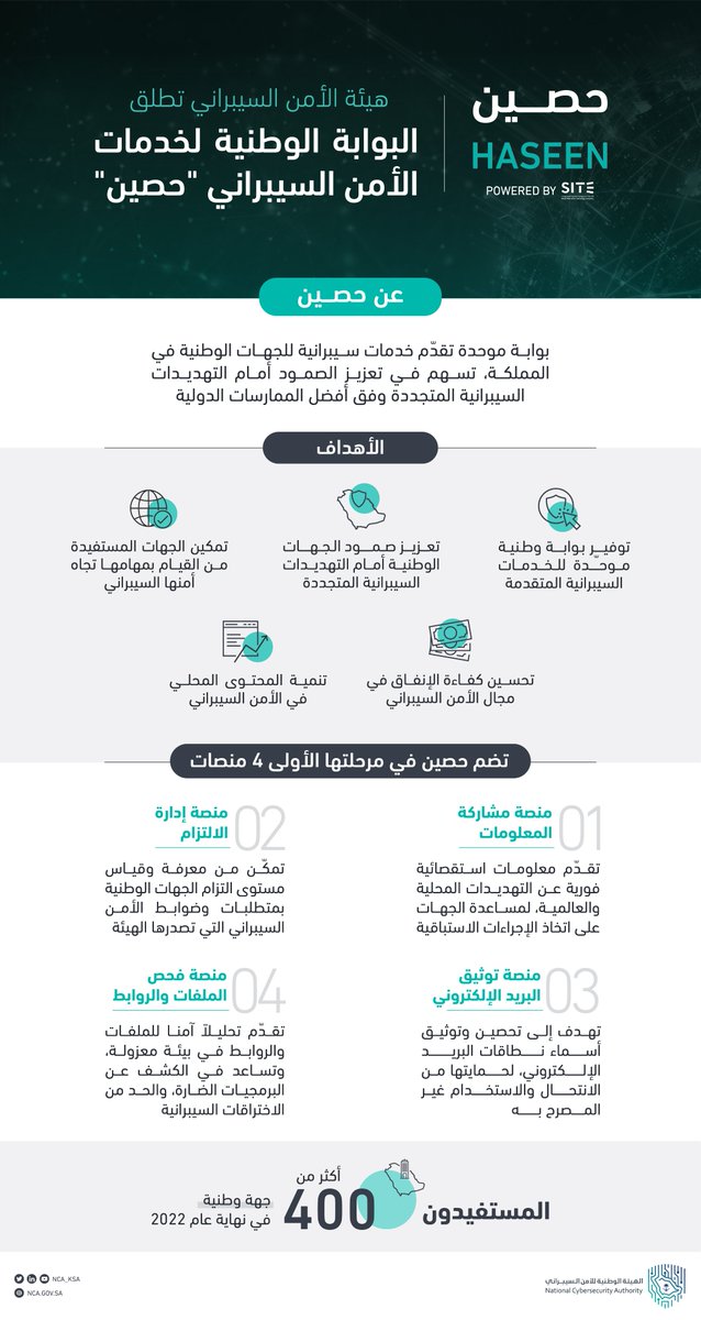 أطلقت #الهيئة_الوطنية_للأمن_السيبراني البوابة الوطنية لخدمات الأمن السيبراني في المملكة «حصين» والتي تضم 4 منصات في مرحلتها الأولى، وتعمل على تحسين آلية تقديم الخدمات وتعزيز صمود الجهات الوطنية أمام التهديدات السيبرانية.
