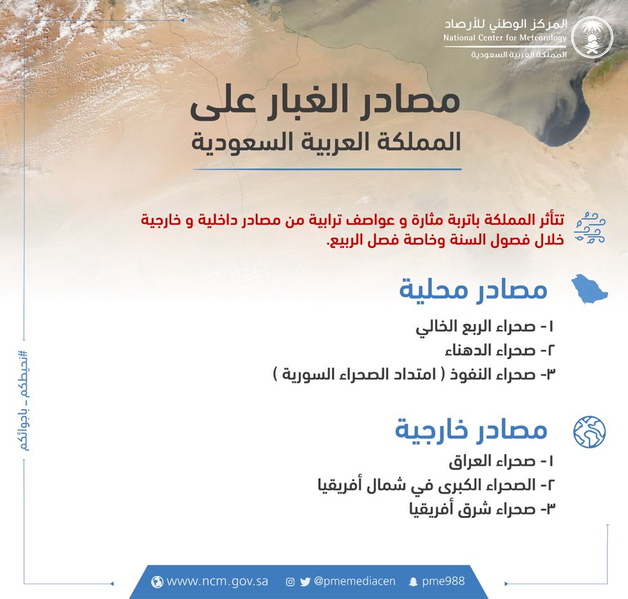 بل وحتى من الدرع العربي، لكون معظم أراضينا مكسوة بالرمال الدقيقة، والمفككة، والمجردة من الشجيرات والأشجار، وعليه فمصادر الغبار المحلية لا تنحصر #فقط في المسطحات الرملية الكبرى (الربع الخالي، النفود الكبير، الدهناء) كما ورد في منشور الأرصاد، بل تولد العواصف الغبارية