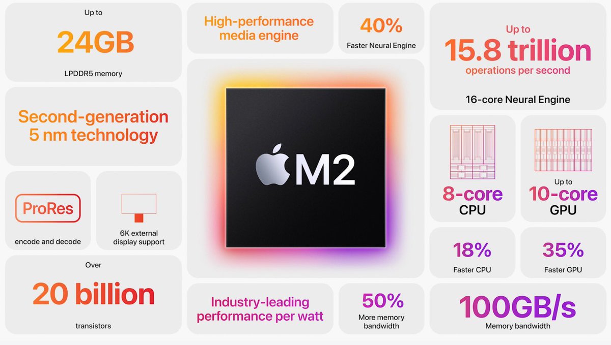 معالج M2 يقدم اداء افضل مع تقليل استهلاك الطاقة وهو مبني على معمارية 5 نانومتر المحسّنة مع 20 مليار ترانزستور (25٪ أكثر من M1) برضو اداء الرسوميات في المعالج أعلى بنسبة 25٪