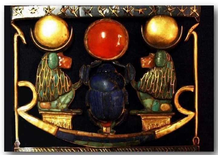 القلادة تصور إثنين من قردة البابون يعلوهم القمر على رؤوسهم يتعبدون لنتر الشمس خبرى بشكل خنفساء الجعران وهو يحمل فوق رأسه قرص شمس من العقيق والثلاثة على قارب شمسي يحمل الشمس والقمر عبر السماء ومن أعلى شريط من اللازورد لونه أزرق وعليه نجوم يدل على السماء ومن أسفل شريط يدل على البحر