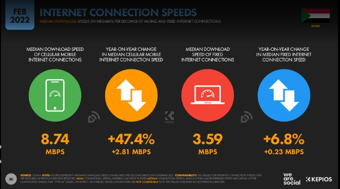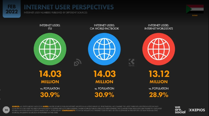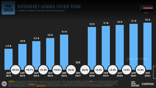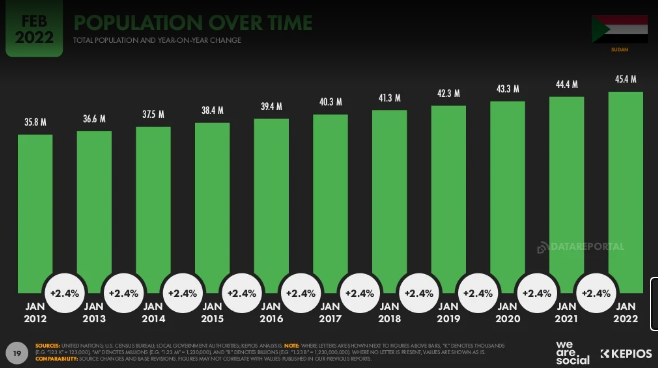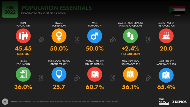 بلغ إجمالي عدد سكان السودان 45.45 مليون نسمة في يناير 2022 م وتشير البيانات إلى أن عدد سكان السودان زاد بمقدار 1.1 مليون (2.4%) بين عامي 2021 و 2022 م
