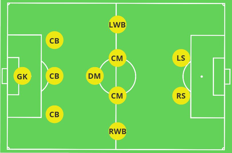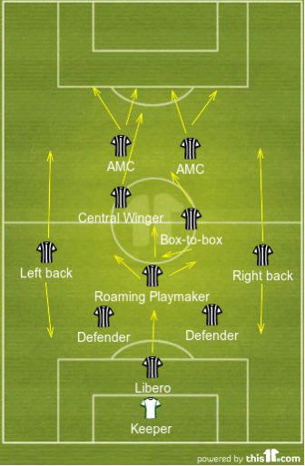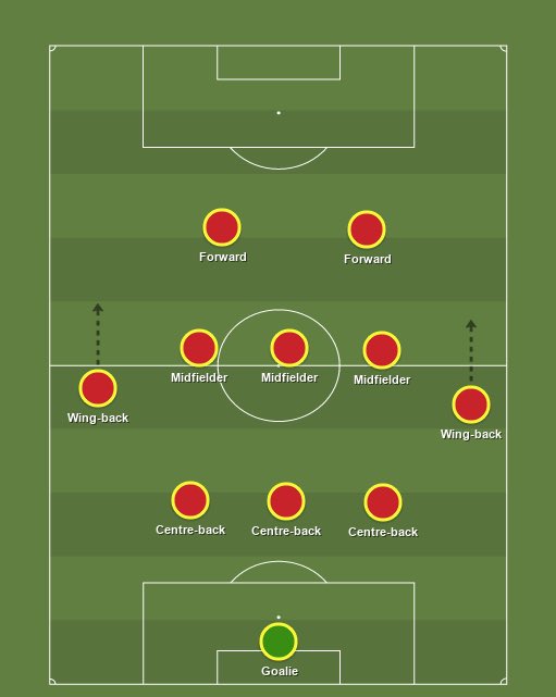 3 مدافعين بدنيين وواحد منهم على الاقل يجيد التمريرات الطوليه و3 لاعبي ارتكاز في المنتصف واحد منهم يبقى في الخلف لتأمين الدفاع ،من اهم الخطوط الذي يتطلب لاعبين ذو جودة عاليه وبجانبهم جناحين لديهم ادوار كبيره في دعم الهجوم والتغطيه الدفاعيه ايضاً وفي الامام مهاجمين ذو خصائص مُختلفه