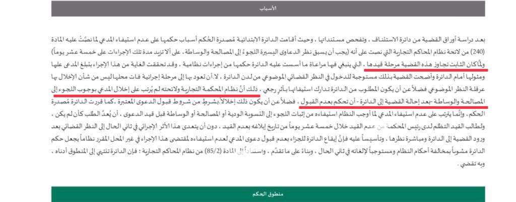… ويتضح ذلك بمطالعة الباب الثالث من نظام المحاكم التجارية، وبمجرد قيد الدعوى تكون القضية قد دخلت تحت الولاية القضائية وأصبح من اللازم الفصل في موضوعها.