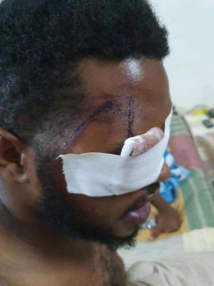 تمت محاصرتي من قِبل خمسة أو سبعة من الجنجويد، وبدأ الضرب المبرح على كل الجسد، مستهدفين الرأس واليدين والظهر، ممزوجٌ بكل الألفاظ النابية وكلمة "يا كافر" و"يا كفار" علي وجه التحديد، كان الضرب