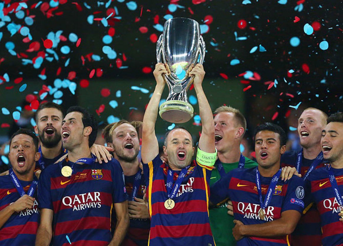 انيستا بشارة الكابتن يحمل كأس السوبر الأوروبي 2015 بعد مباراة ماراثونية امام اشبيلية 5-4