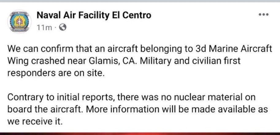 تحطمت طائرة عسكرية من طراز MV-22B Osprey تابعة لوحدة مشاة البحرية في ولاية كاليفورينا الأمريكية على بعد 48 كيلو متر من حدود المكسيك وكانت تحمل مواد نووية☢️