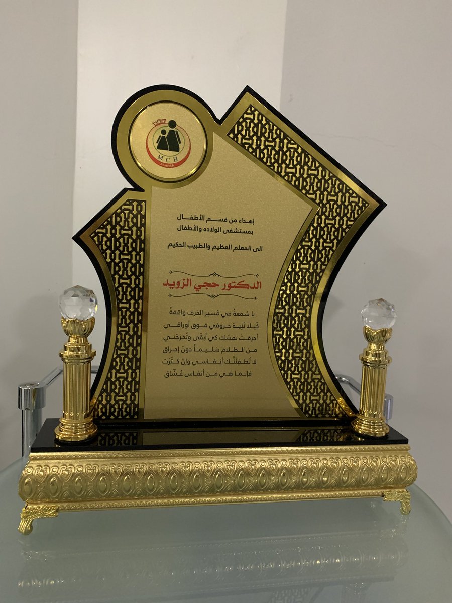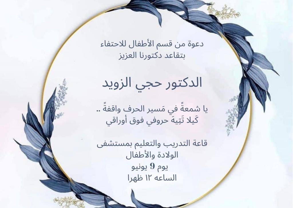 أتقدم بوافر آيات الشكر والامتنان إلى جميع أطباء وطبيبات الأطفال بمستشفى الولادة و الأطفال على الحفل الرائع الذي أقاموه وما قدموه إلي من كلمات و هدايا قيمة والذي يعكس جانب الوفاء الإنساني لديهم، كما أشكر كل الأطباء والطبيبات من مختلف مستشفيات المحافظة الذي شاركونا بالحضور.