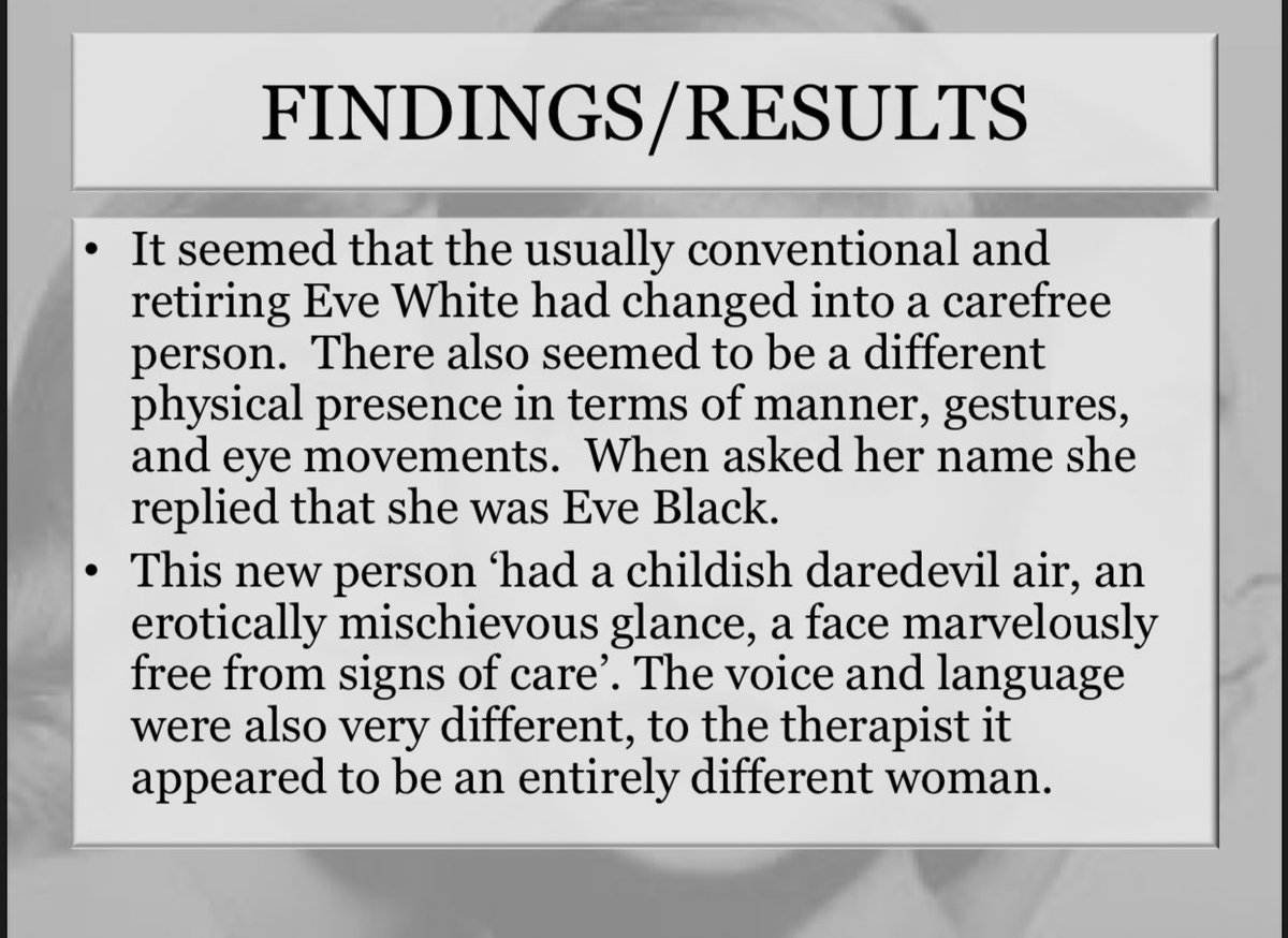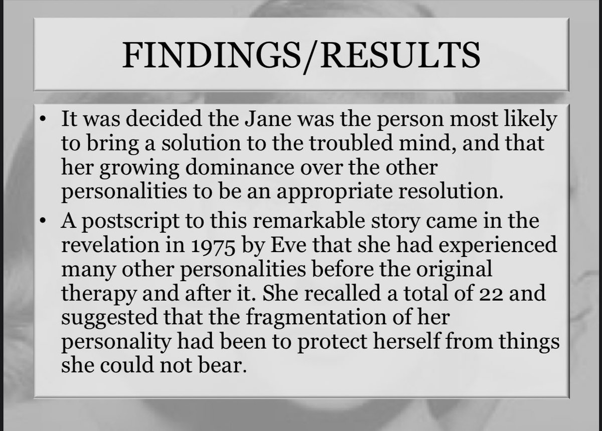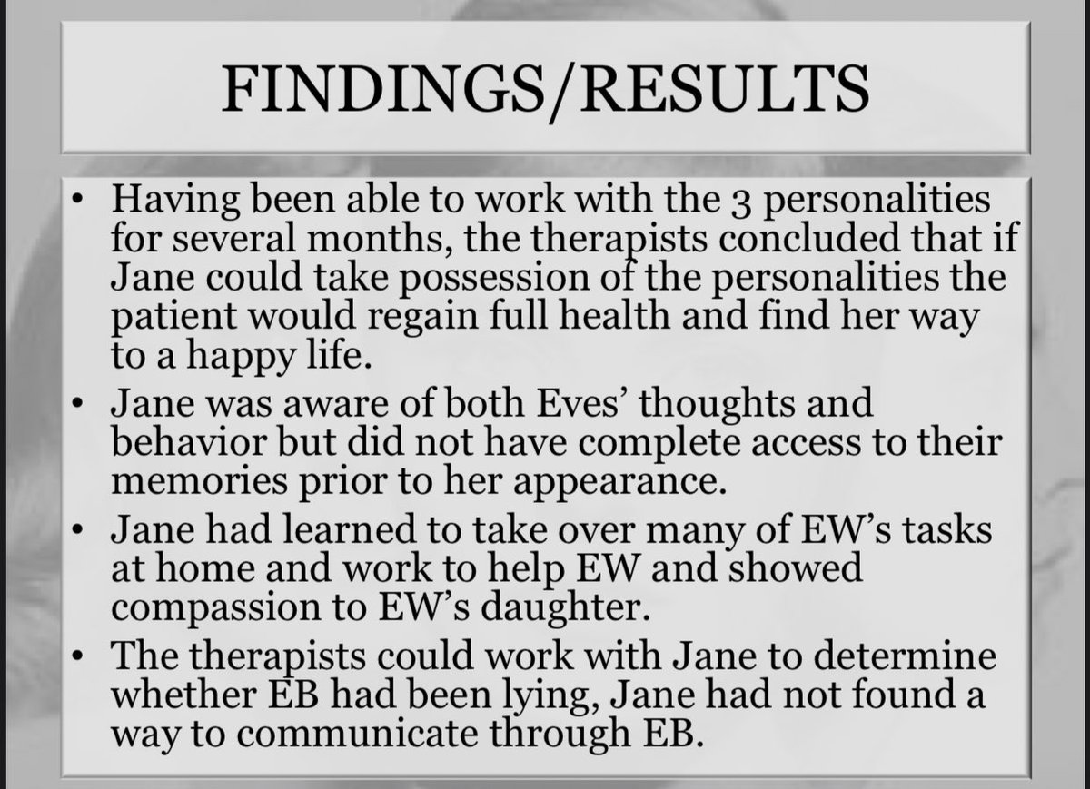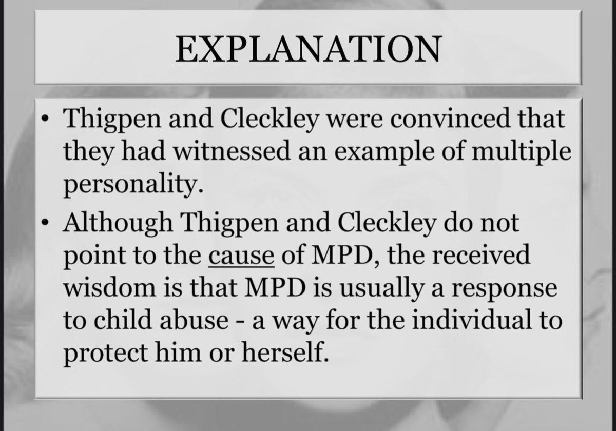 ذكر ثيغبن معلومة أنه من الممكن ان هذه الحالة تطوّرت وأن كريستين صنعت هذه الشخصيات بسبب أنها شهدت حادث مروّع في طفولتها ومات أمامها شخصان، وكل هذا خلال ٣ شهور فقط.