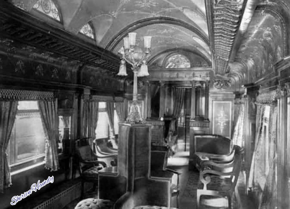 3-كانت العربة الثانية هي الأخرى مُقسمة إلى قسمين الأول فيه غرفة النوم للملك ملحق بها مطبخ ودورة مياه واثنين صالون ملكي الذي تكون من كرسي للملك و4كراسٍ للضيوف وترابيزة تسع4 أشخاص للإجتماعات أما القسم الثاني فيوجد به كابينة موسيقي بها راديو جرامافون وحمام خاص للملك وتليفون لاسلكي👇