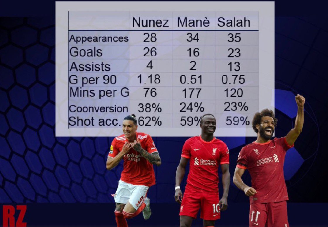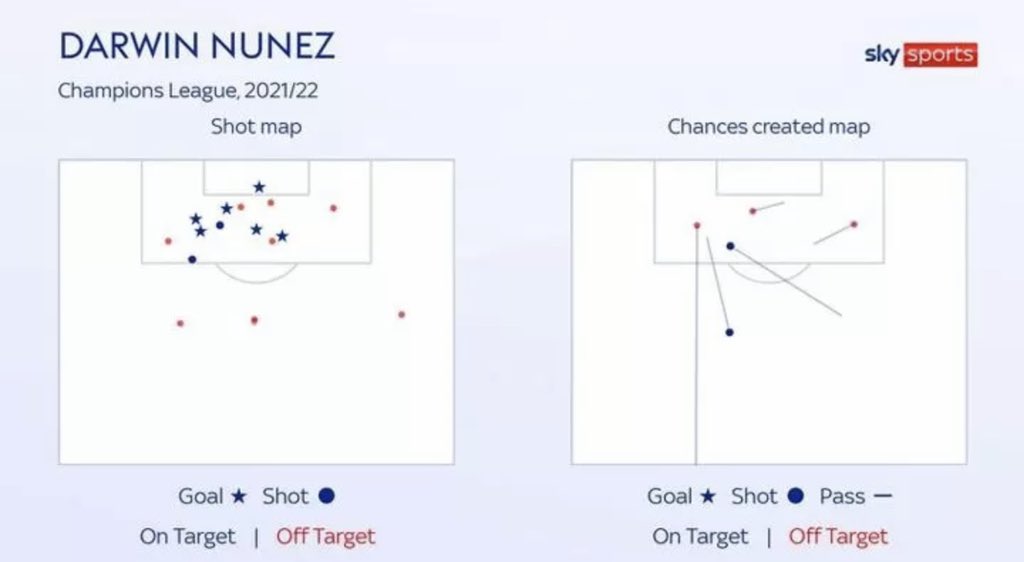 من حيث المحاولات على المرمى، لا يخجل نونيز من إطلاق محاولة من النطاق ولكن لديه موهبة في العثور على الهدف، والجزء الخلفي من الشبكة، من منطقة يسار الوسط - وهي منطقة يهيمن عليها ماني في إعداد ليفربول الحالي.