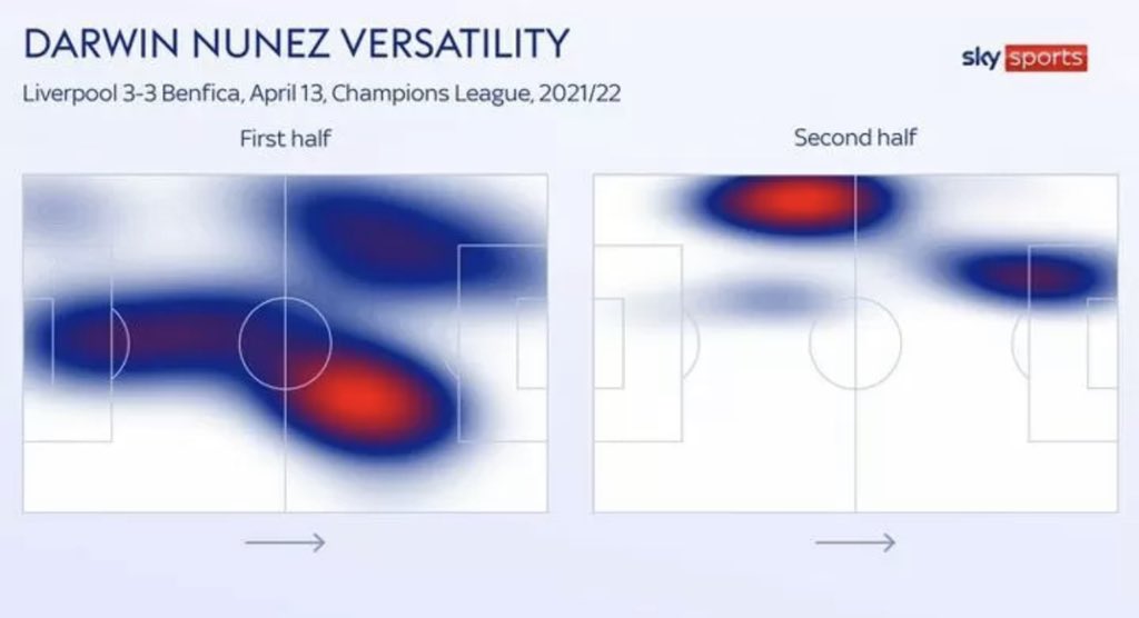 في الواقع، اختبر مدرب ليفربول نونيز عندما واجه في الأنفيلد و توضح الخرائط الحرارية أدناه كيف غير نونيز الأدوار في الشوط الثاني، وانتقل من القيام بأدوار مختلفة في منطقة يمين الوسط إلى الجناح الأيسر.