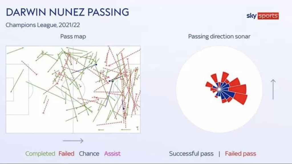 كما يشير الرسم البياني ادناه، سجل نونيز بالفعل أربع تمريرات حاسمة خلال مشاركته الأوروبية الموسم الماضي ولكن التصور إلى اليمين أدناه يظهر تمريرات تؤدي مباشرة إلى تسديدة ويشير إلى أنه عادة ما يسرح تمريرات قصيرة داخل Box ولكن يمكنه أيضا العثور على زملائه في الفريق من خارج المنطقة