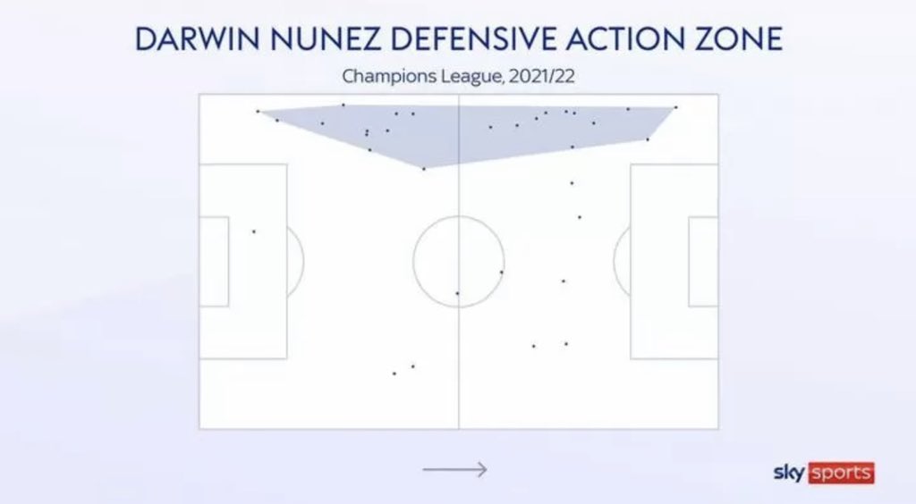 من المؤكد أن أسلوبه الغير تقليدي يناسب فلسفة كلوب في ليفربول وتكشف التصورات أدناه كيف يتتبع نونيز أيضا بشكل متكرر ويمكنه الاندماج مع اللاعبين عبر الملعب عند تبني تغيير الأدوار في المباراة .