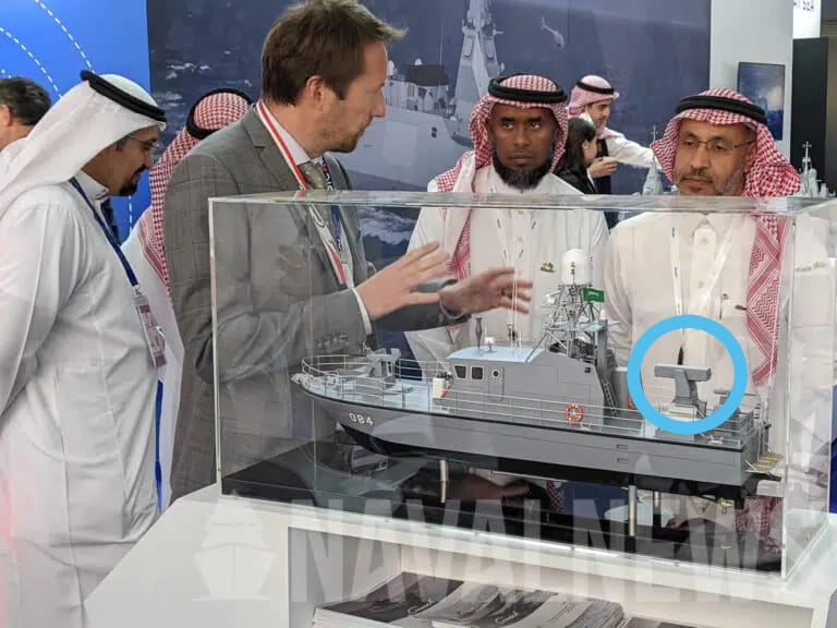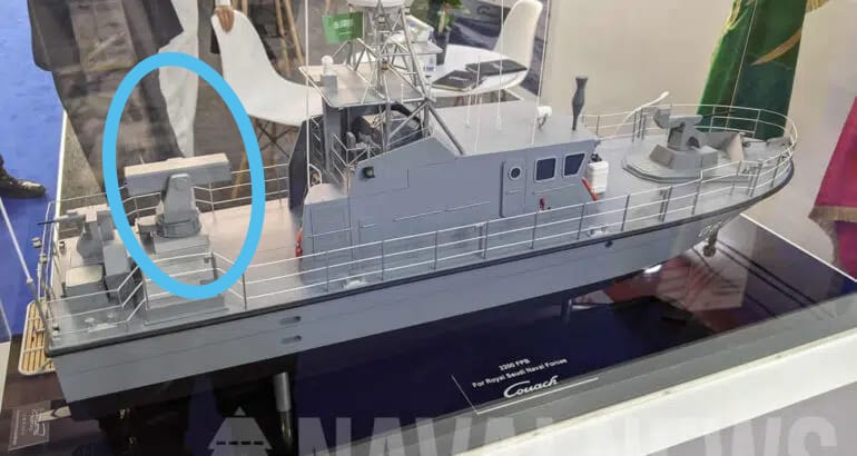 ظهر في معرض الدفاع الدولي بالرياض مجسم لزوارق ال 2200 FPB الفرنسية التي قد طلبتها القوات البحرية الملكية السعودية 🇸🇦 للقيام بمهام حماية البنية التحتية الحساسة مزودة بقاذف النسخه البحريه من صواريخ Poniard 70mm