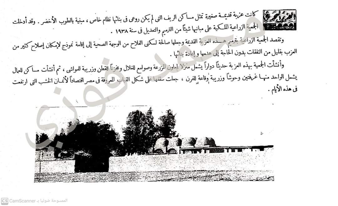 ٧ وبما ان العزبة عندنا كانت قديمة نوعا ما عند شراء الجمعية للأراضي الزراعية من ورثة احمد بك ابو أصبع فقد قامت بتطويرها وبناء منازل جديدة على شكل قباب وهو نموذج استخدمه المهندس المعماري حسن فتحي ليلائم البيئة.
