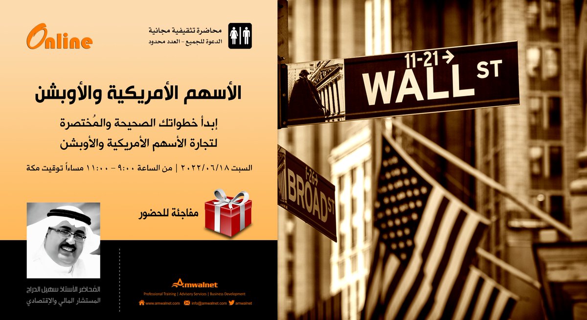 يسرني دعوتكم لحضور المحاضرة المجانية: "الأسهم الأمريكية والأوبشن"، والتى سنتناول فيها مميزات هذه التجارة والخطوات الصحيحة والمختصرة للوصول لها.. ستُعقد المحاضرة بإذن الله يوم السبت 2022/6/18 الساعة 9:00-11:00مساءاً توقيت مكة، التسجيل من الرابط التالي: bit.ly
