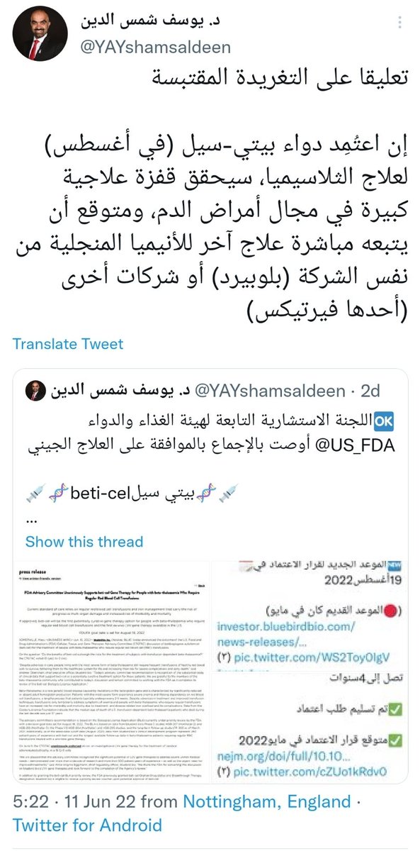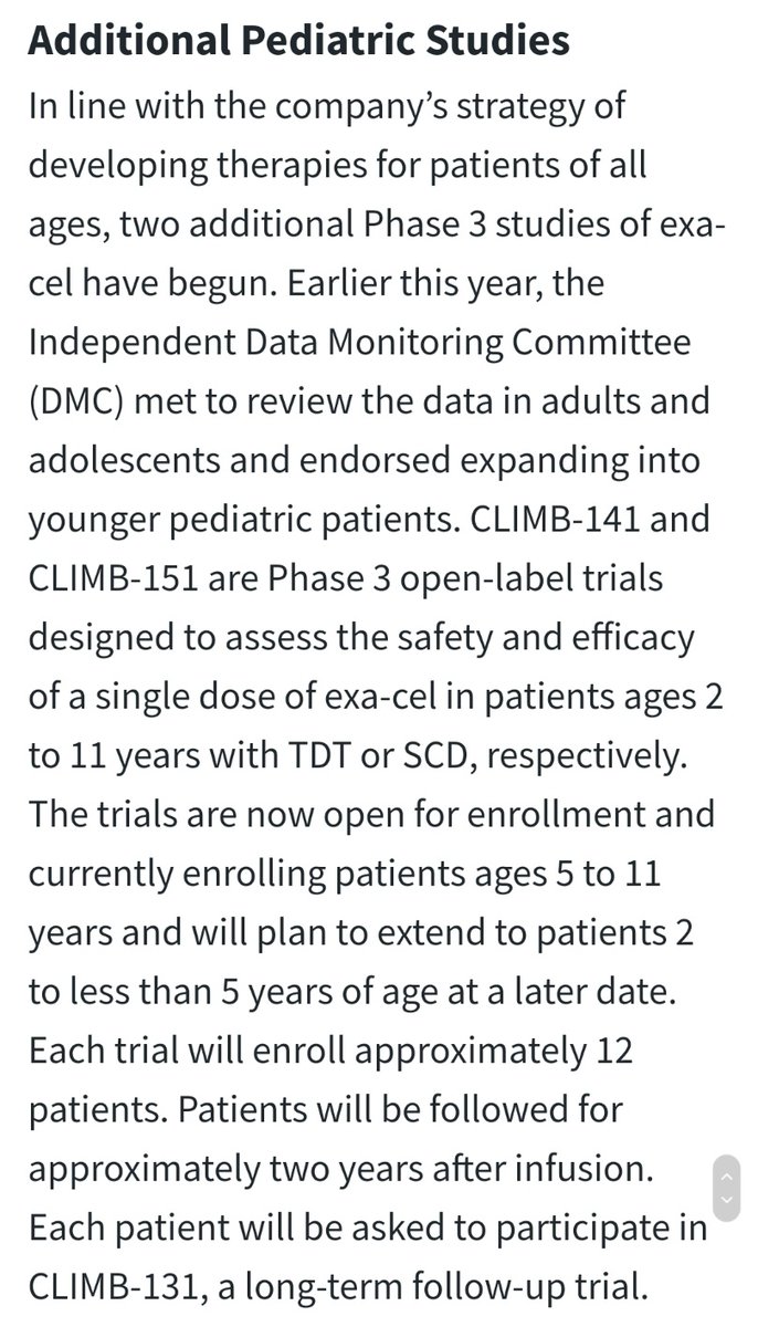 @Sikclecell @EMA_News @US_FDA @AgiosPharma @VertexPharma @GBT_news @Novartis @PrecisionBioSci @CRISPRTX بلوبيرد @bluebirdbio تعلن عودة التجارب الإكلينيكية للأطفال بعمر٢-١٧عام للدواء الجيني التجريبي