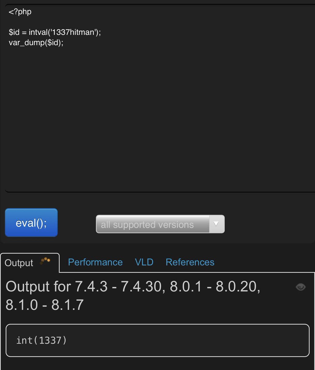 ٤- احيانا يوم اجرب افحص انبوت او مدخل بالموقع يطلب رقم معرف او ايدي ، فاجرب احط رقم موجود و اشوف النتيجة ، بعد كذا اضيف حروف جمب هذا الرقم ، اذا شفته طلع لي نفس النتيجة و ما اعطى اي انتباه للاحرف ، فاعرف انه يحول المدخل الى انتجر او رقم ، فهنا راح يسحب على اي حرف او رمز ينكتب